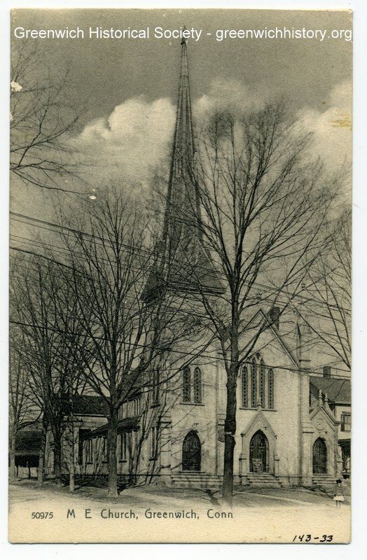 An image of the white church building with a tall steeple and arched windows. There are trees and paths in the foreground.Collection