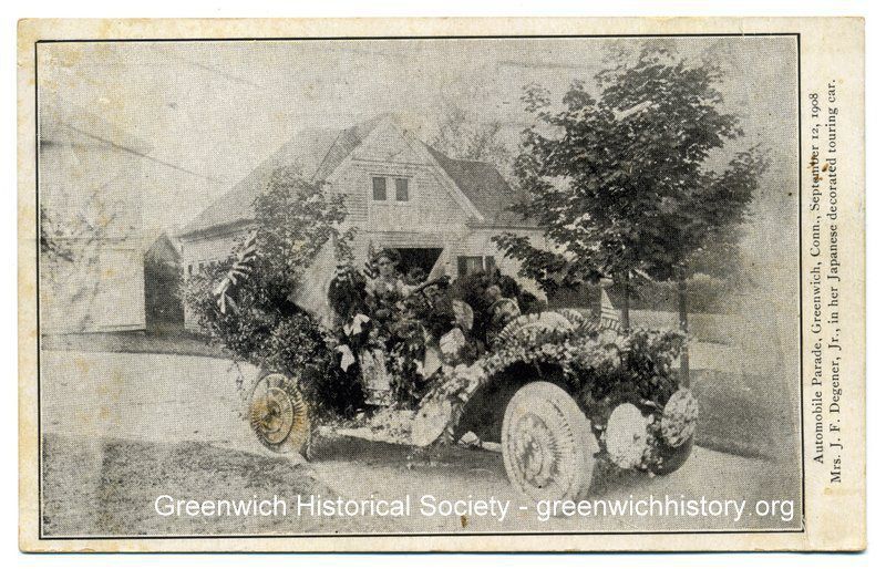 A black and white image of the Automobile Parade in Greenwich on September 12, 1908. A woman is sitting in a car decorated with flowers and flags. The car is parked in front of a house and a tree.Collection