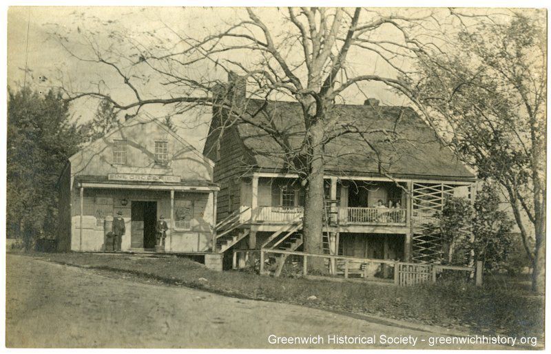 A two-story home with a storefront attached to the right side. The storefront on the right has a sign that reads "Pink Groceries." A few people sit on the porch of the main house which is on the second story. Two men stand on the porch to the store on either side of the door.Collection