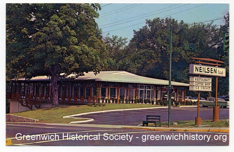 A one story building with large pane windows and a flat roof. Next to the restaurant is a parking lot with cars parked and a sign in the front reads "Neilsen East, Restaurant, Coffee Shop, Ice Cream."Collection