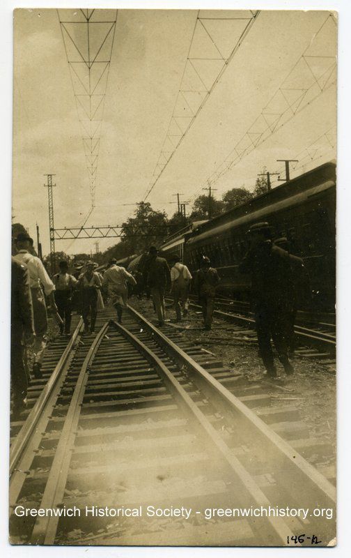 A view of people standing on the train tracks next to a train that derailed. The men are walking away from the viewer.Collection
