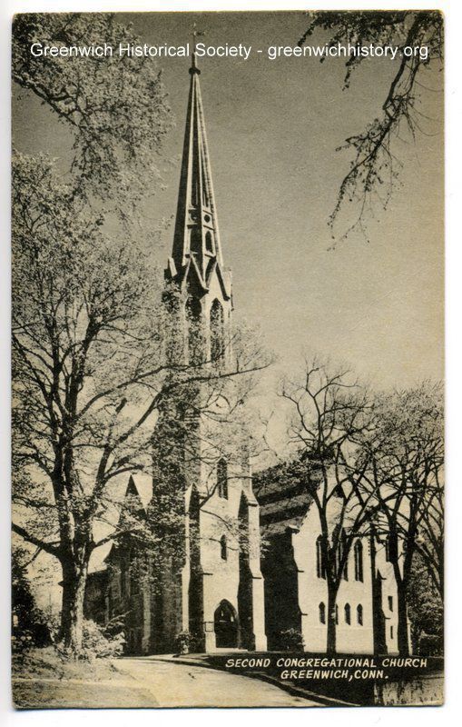 An image of the church from the road, showing the tall steeple and the path up to the front entrance. Trees line the sidewalk in front of the church.Collection