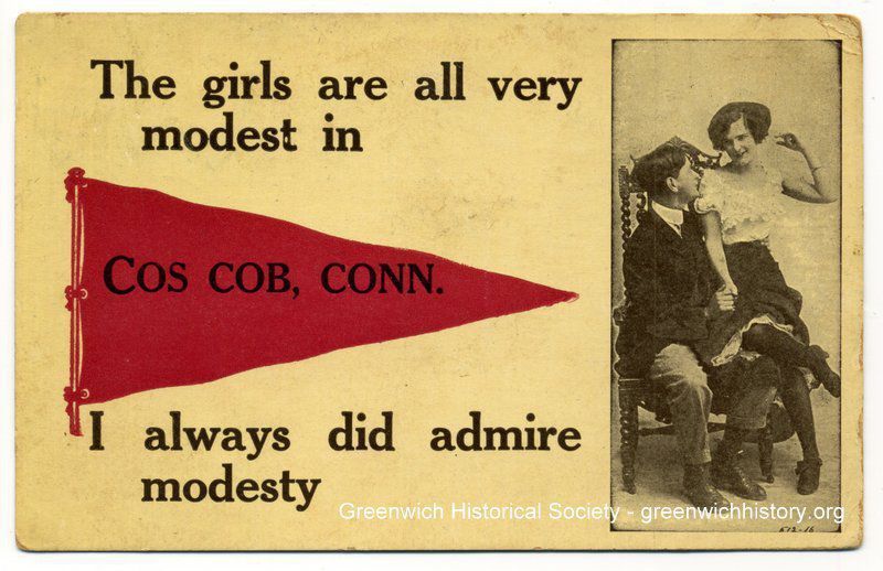 Located on the right side of the card is a black and white image of a woman sitting on a man's lap, with the couple gazing at each other. Next to this image are black words and a red triangle pennant with the words "Cos Cob, Conn." in the middle.Collection