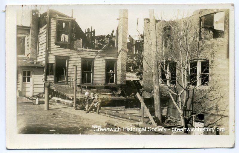 Three children seated on the ground in front of the remains of a burned building. The roof of the burned building has collapsed.Collection