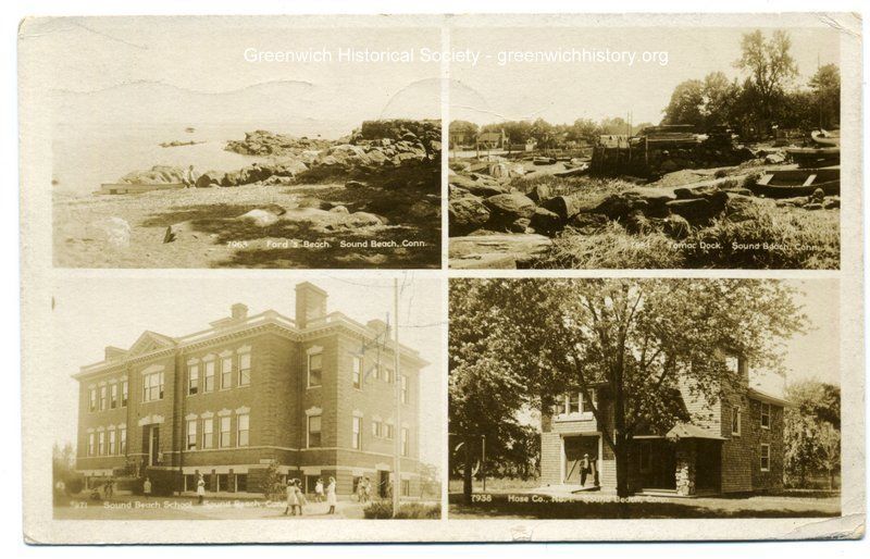A black and white postcard displaying four specific places that are in Sound Beach, including Ford's Beach, Tomac Dock, Hose Company No. 1, and Sound Beach School.Collection