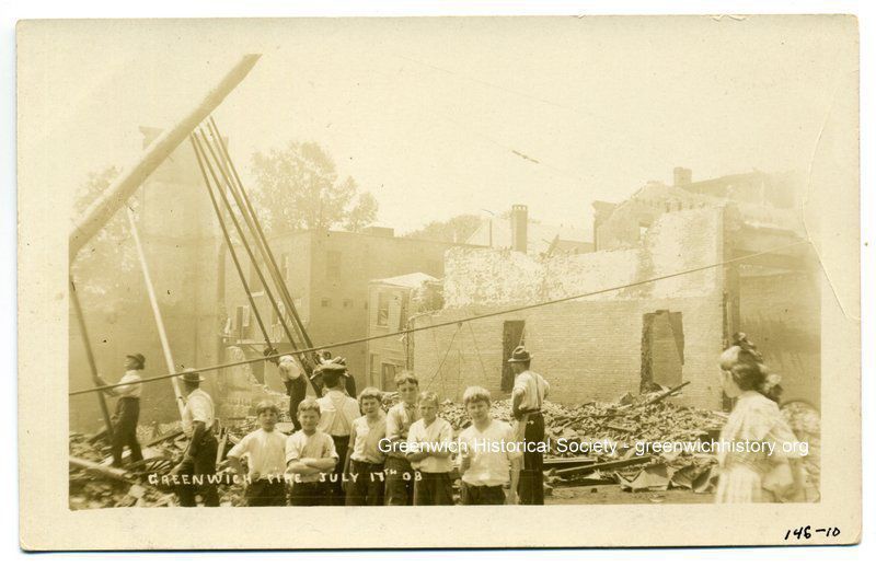 People picking through the rubble left by the fire. A group of six boys are standing in the foreground, posing for the camera, as one woman walks by.Collection