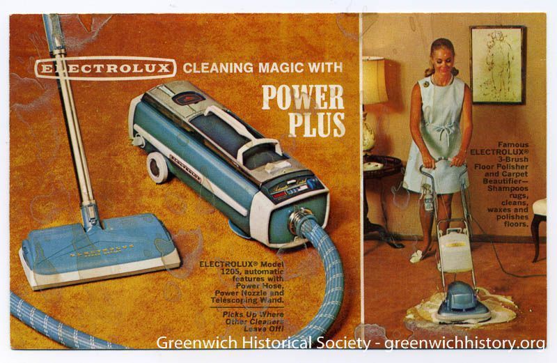 A postcard advertising a vacuum cleaner known as the "Electrolux." It is the 1205 model with automatic features and a power hose, power nozzle, and telescoping wand. Another image shows a woman, in a sky blue dress, polishing the floor using an "Electrolux" 3-brush floor polisher and carpet beautifier.Collection