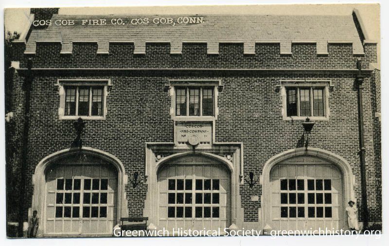 A close view of the front entrance of the Cos Cob Fire Department. A two-story brick fire house with segmental doorways, a chimney, and a parapet roof. Two people are standing on either side of the building.Collection