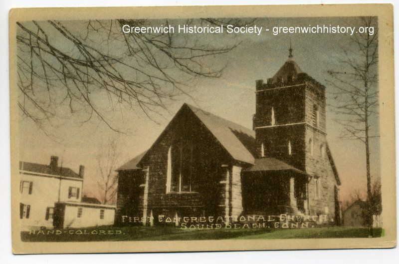 An image of the church showing the side of the stone church, including the square tower and arched windows. The neighboring buildings can be seen in the background.Collection