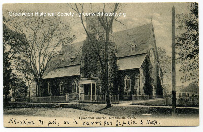 A depiction of the stone church showing the iron fence and the entrance. The tower over the entrance is grown over with ivy.Collection