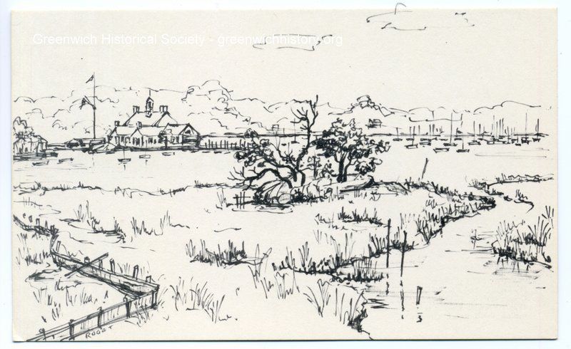 A sketch of marshy shoreland in the foreground with sailboats in the right side of the background and the yacht club and flagpole in the left side of the background.Collection