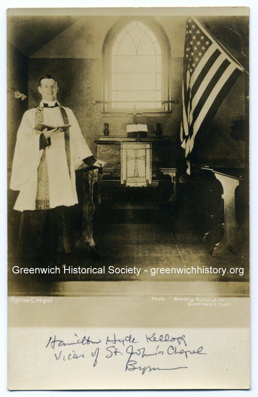 An image of the inside of the chapel with the Vicar standing by the organ. Above the organ is an arched window and next to the organ is an American flag. The vicar holds an open book.Collection
