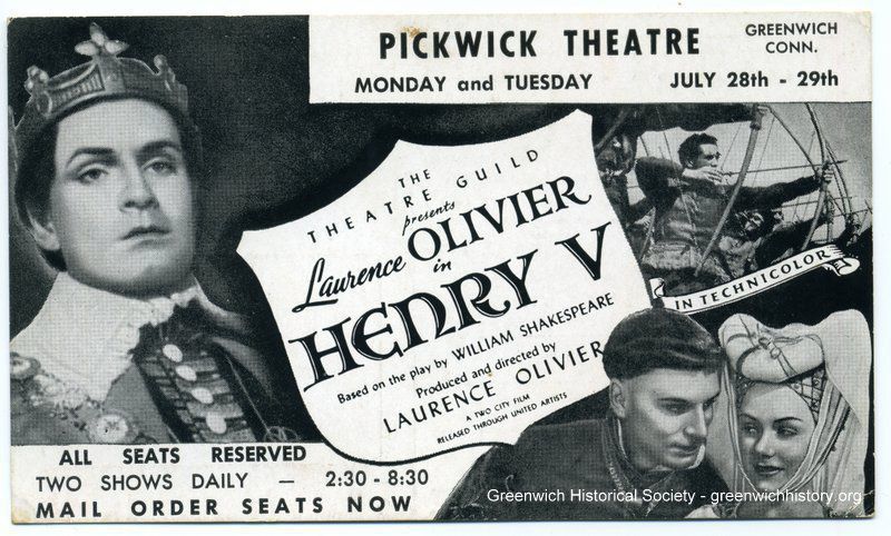 A black and white postcard advertising the show "Henry V" at Pickwick Theatre. On the left side of the card is an image of a man nicely dressed and wearing a crown. A shield advertises the name of the show and producers, in the middle, and then on the left side is an image of a man performing archery and a man and a woman.Collection