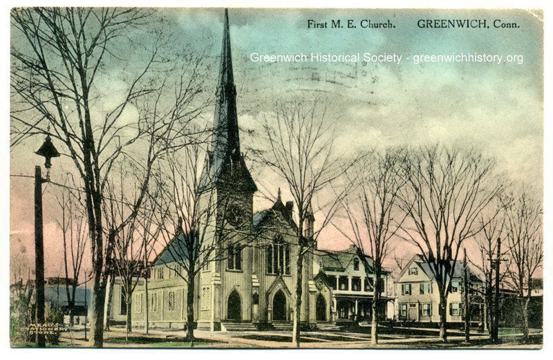 A depiction of the white church showing the tall steeple and sharply arched door frames. The view shows the street and neighboring buildings.Collection