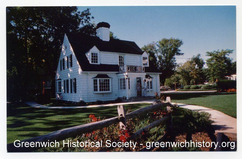A two-story home, painted white, with a large central interior chimney. There is a small porch above the front entrance with a white railing. A man and a woman stand by the front entrance about to enter the home. In the foreground is a wooden fence with red flowers.Collection