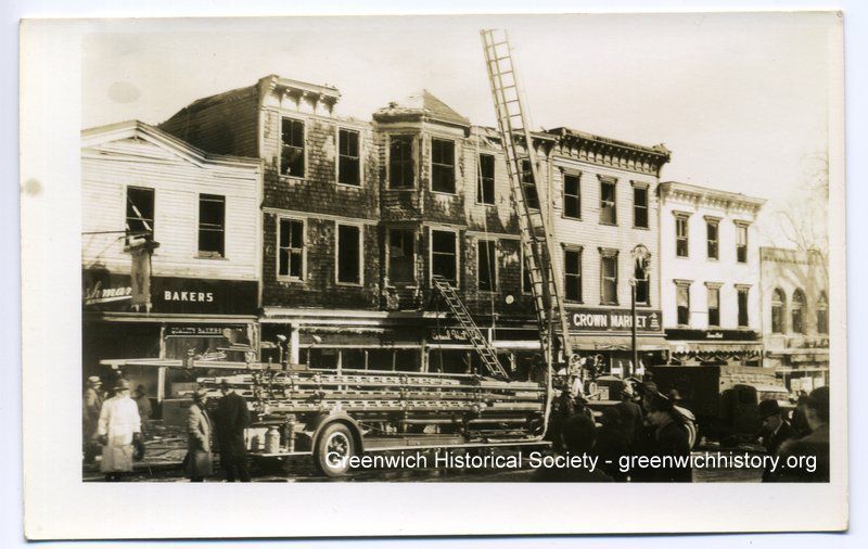 An image of fire engines with their ladders extended to the windows of the burning businesses. People stand in the foreground watching the firefighters.Collection