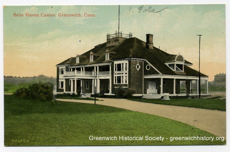 Street view of the casino, showing the porch and portico with columns. A large American flag is flying from the roof.Collection
