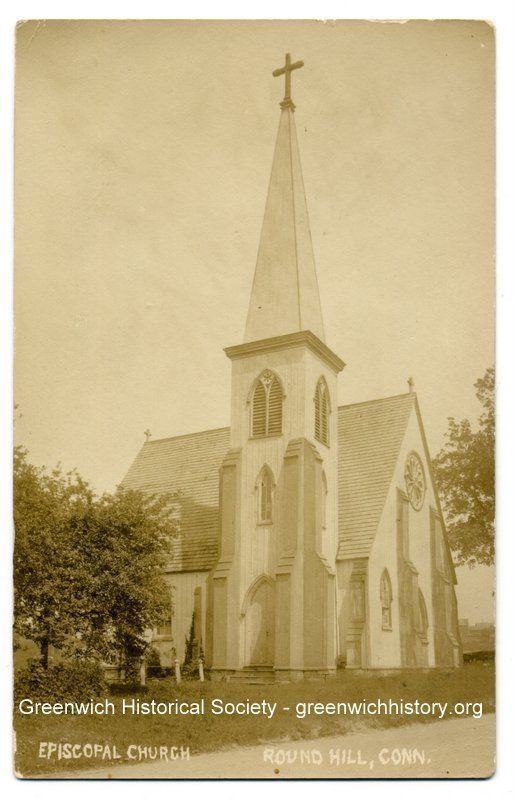 An image of the side of the church, showing the steep roof and tall steeple, topped with a cross.Collection