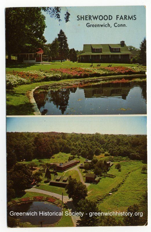 A vertical postcard with two colored images; one of the lake and house and the other image of an aerial view of the property. This farm, owned by the Sherwood Family since 1756, is one of the oldest farms in New England, owned by the same family for nine generations. For the past 25 years it has been operating as a Poultry Farm.Collection