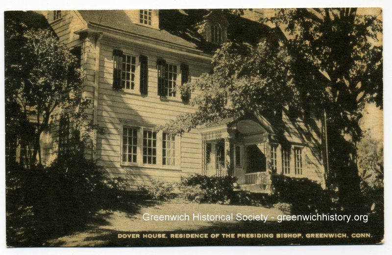 An image of the front entrance of the white house with portico and shutters. A tree obscures part of the front of the house. The Dover house is where the presiding bishop lived.Collection