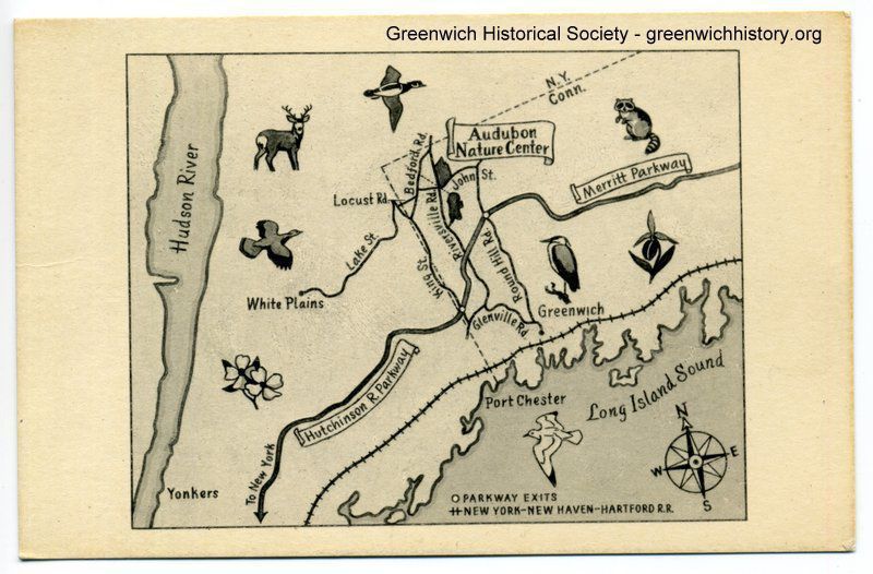 A black and white map of the border of Connecticut and New York. It specifically highlights the Audubon Center and major parkways. There are a variety of animals scattered throughout the map, which include birds, a deer, and a raccoon.Collection