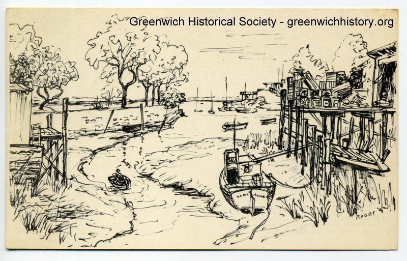 A sketch of Tomac Cove. A small boat travels down the stream passing docks and other boats. In the background are other sailboats on the water.Collection