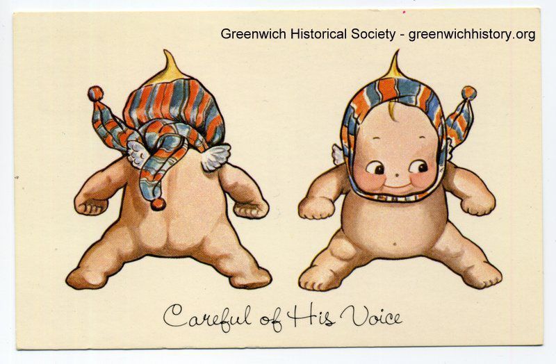 A cartoon image of a young boy, with wings and blond hair, wearing a red, white, and blue scarf around his neck and head. This card is number 4 in a series of 12.Collection