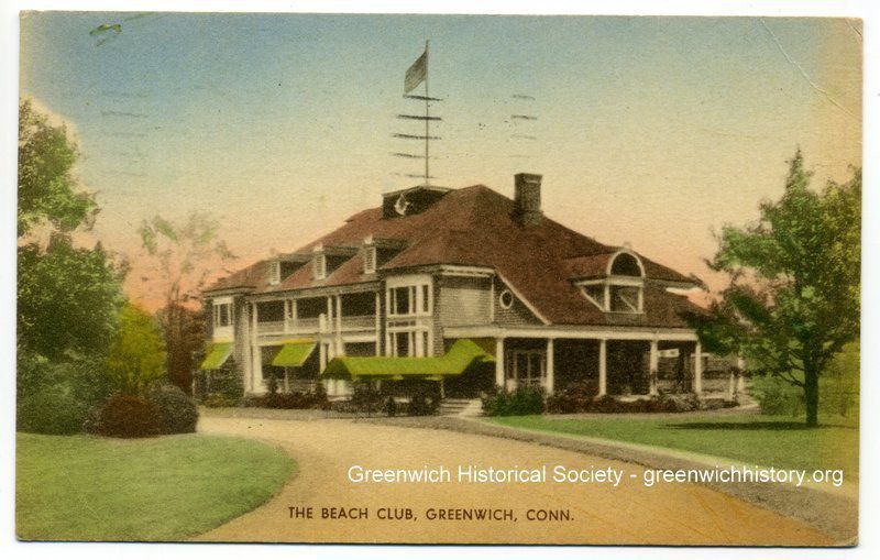 Depiction of the approach to the club building. The building has a reddish roof with a flag flying from the roof. The windows have bright green awnings. There is a wrap around covered porch. The driveway and lawn can be seen in the foreground.Collection
