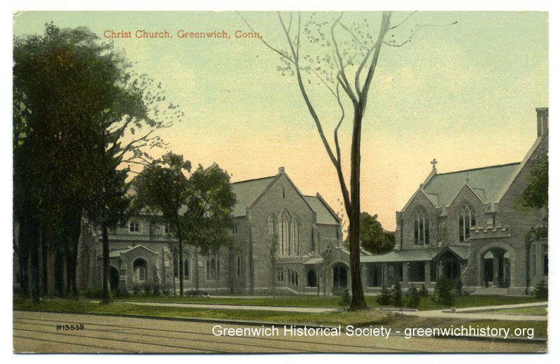 Side view of the church showing the portico and the connector between the two stone church buildings.