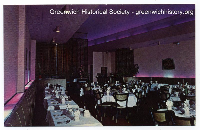 A color image of the inside of the Tahiti Restaurant. The tables have white table cloths. The lighting of the restaurant is a dimmed purple.Collection
