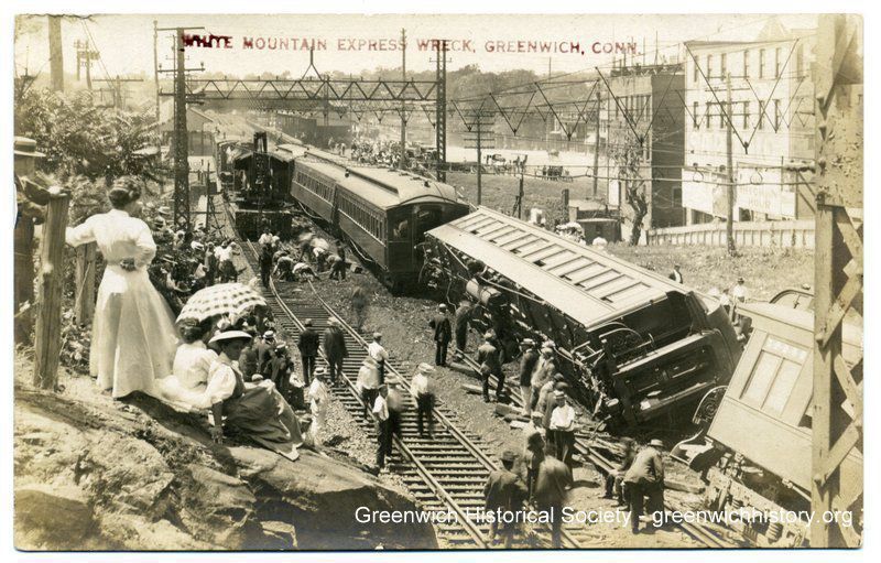 A brighter, distant view of a train wreck. After derailing from the tracks two cars are on their sides. Many men and women stand around the accident. To the left side of the postcard, a woman, dressed in white, stands on a rock with her back to the viewer. Utility poles and wires hang over the accident and buildings can be seen in the background.Collection
