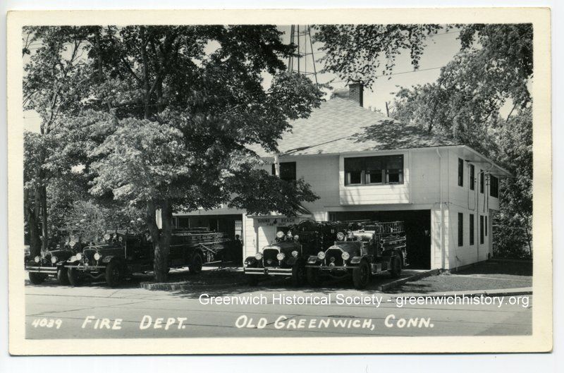 An image of a small white building with double garage doors that four fire engines are emerging from. The front of the building is partially obscured by a tree.Collection