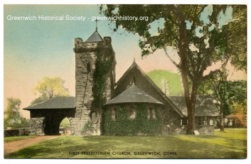 View of the stone church from Putnam Avenue, showing the ivy that covers that side of the building. A portico, square tower, and the distinctive rounded projection can be seen.Collection
