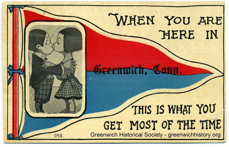 A cartoon image of a man and a woman kissing inside a blue and red triangle flag.