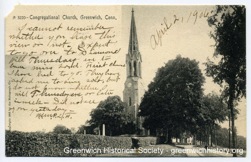 Side view of the stone church showing the tall steeple with a clock in the tower. The rest of the church is partially obscured by trees. In the foreground is a hedge, behind which lies a cemetery.Collection