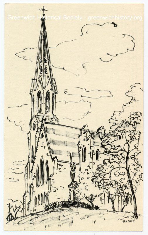 A sketch of the side of the churhc, showing the steeple and a statute.