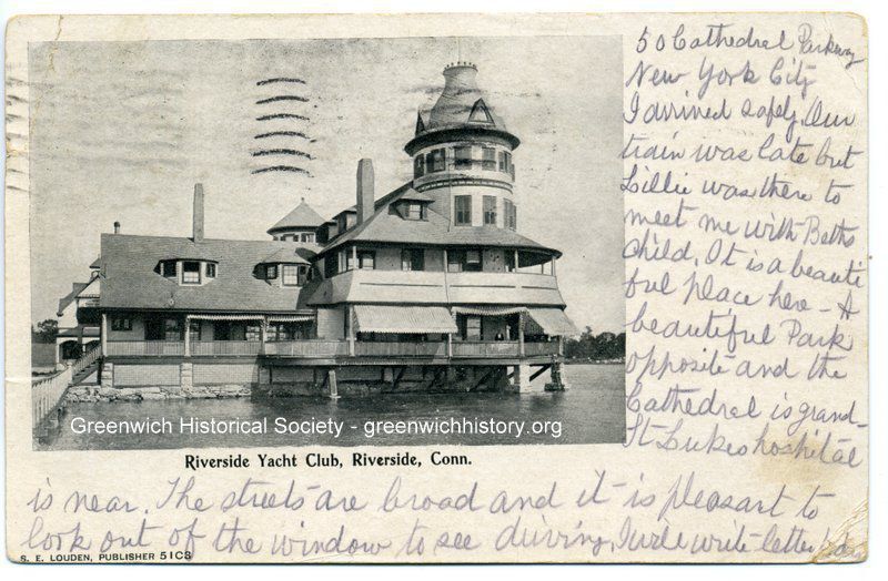 Side view of the yacht club showing the two levels of covered porches and the turret. The porches extend out over the water, which is divided from the club by a stone retaining wall.Collection