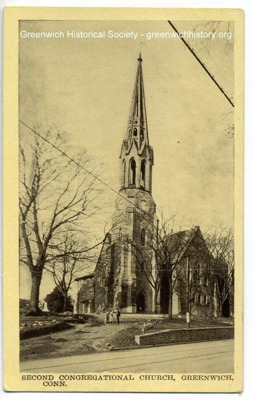 An image of the church from the road, showing the tall steeple and the path up to the front entrance. Three people are walking up the path to the entrance. The trees in front of the church are bare.Collection