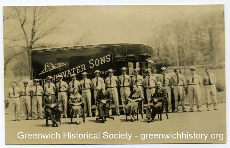 A black and white group image of workers from Drinkwater Sons Inc. Sixteen men stand in uniform and two men and two women sit in chairs. They stand and sit in front of a Drinkwater Sons truck.Collection