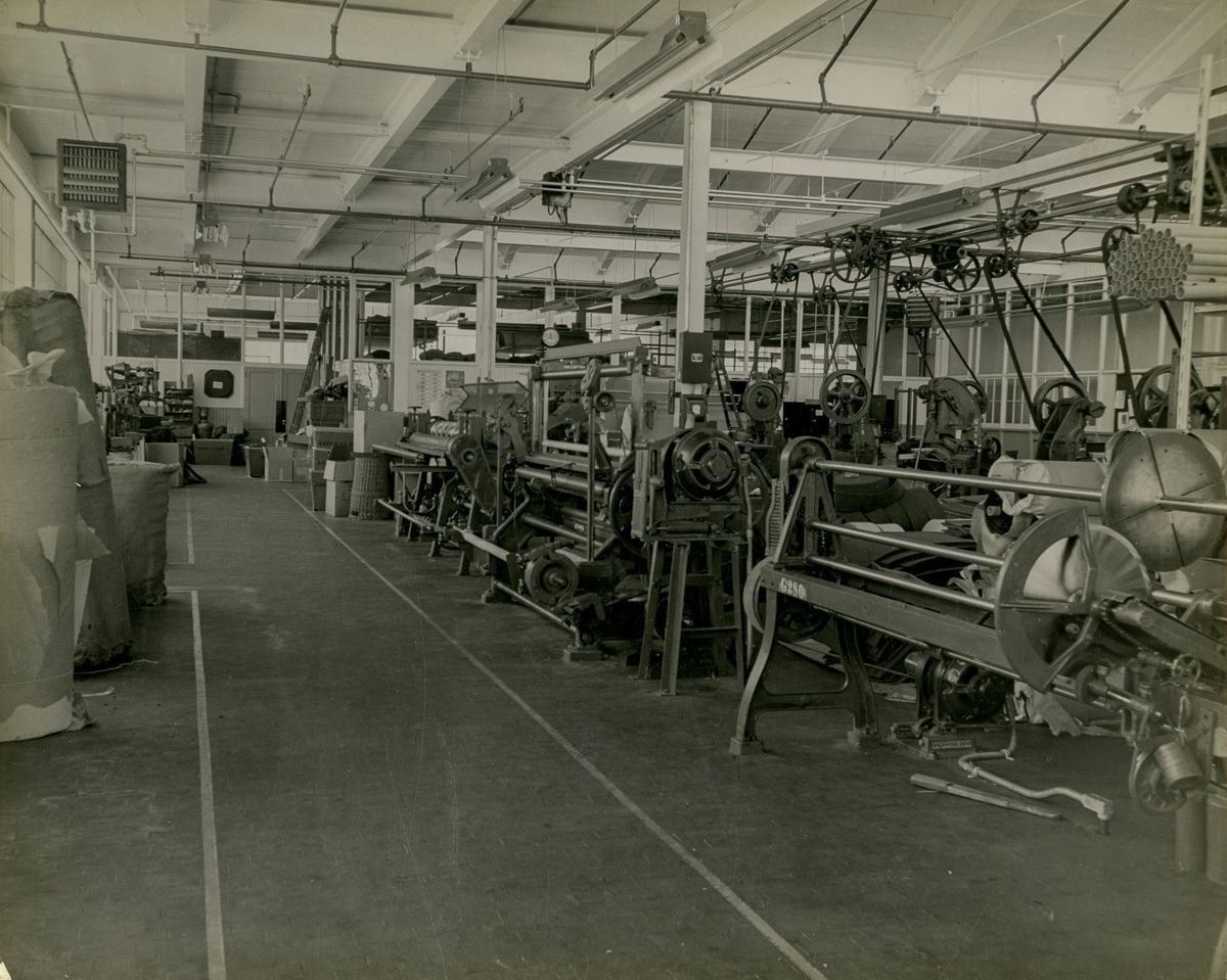 The interior of the cutting shop of the American Felt Company with the cutting machines and large rolls of felt on the left side of the image.Collection