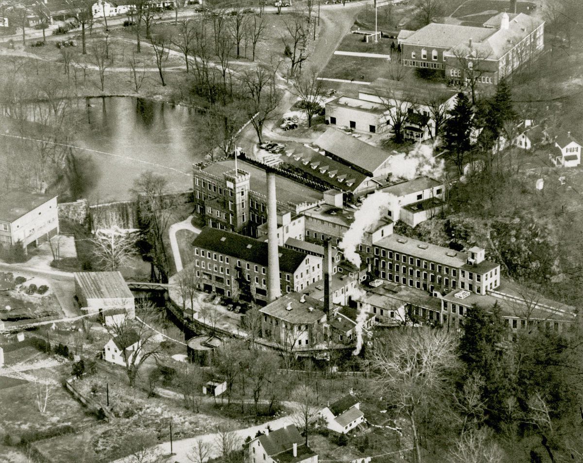 An aerial photograph of the American Felt Company's mill complex on the Byram River, with Glenville School (now the Western Greenwich Civic Center) visible in the background.Collection