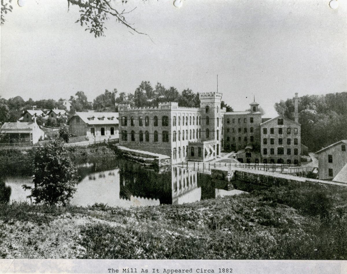 A view of the newly built Gothic Revival brick mill of the American Felt Company from across the mill-pond on the Byram River.Collection