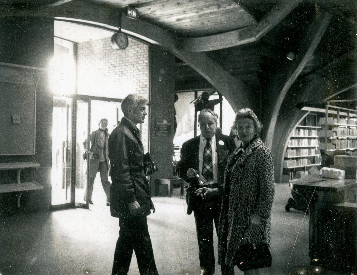 A group of people (one may be a local journalist) at the entrance to the Byram Shubert Library shortly before its opening to the public.Collection