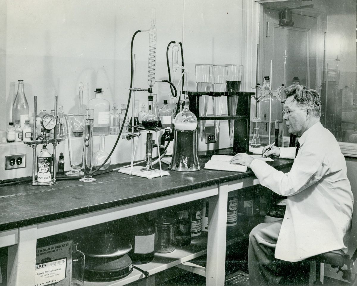 A chemist at the Greenwich Labratories of Canada Dry works to distill an essential oil in a spiral reflex condenser prior to purity tests for quality control.Collection