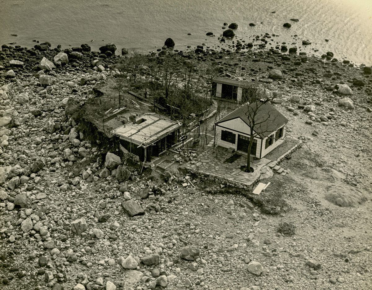 An aerial view of Wee Captain Island during the construction of a building near the main house on the island; a man can be seen working on the roof of the building under construction.Collection