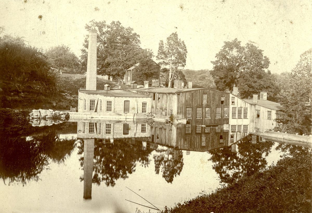A view of the Wilcox Mill, built by Josiah Wilcox (b. 1804 - d. 1883) in 1828 on the Byram River. The Mill produced tinning tools, carriage parts, and according to a likely apocryphal story cannon shot and gun-carriage parts during the Civil War.Collection