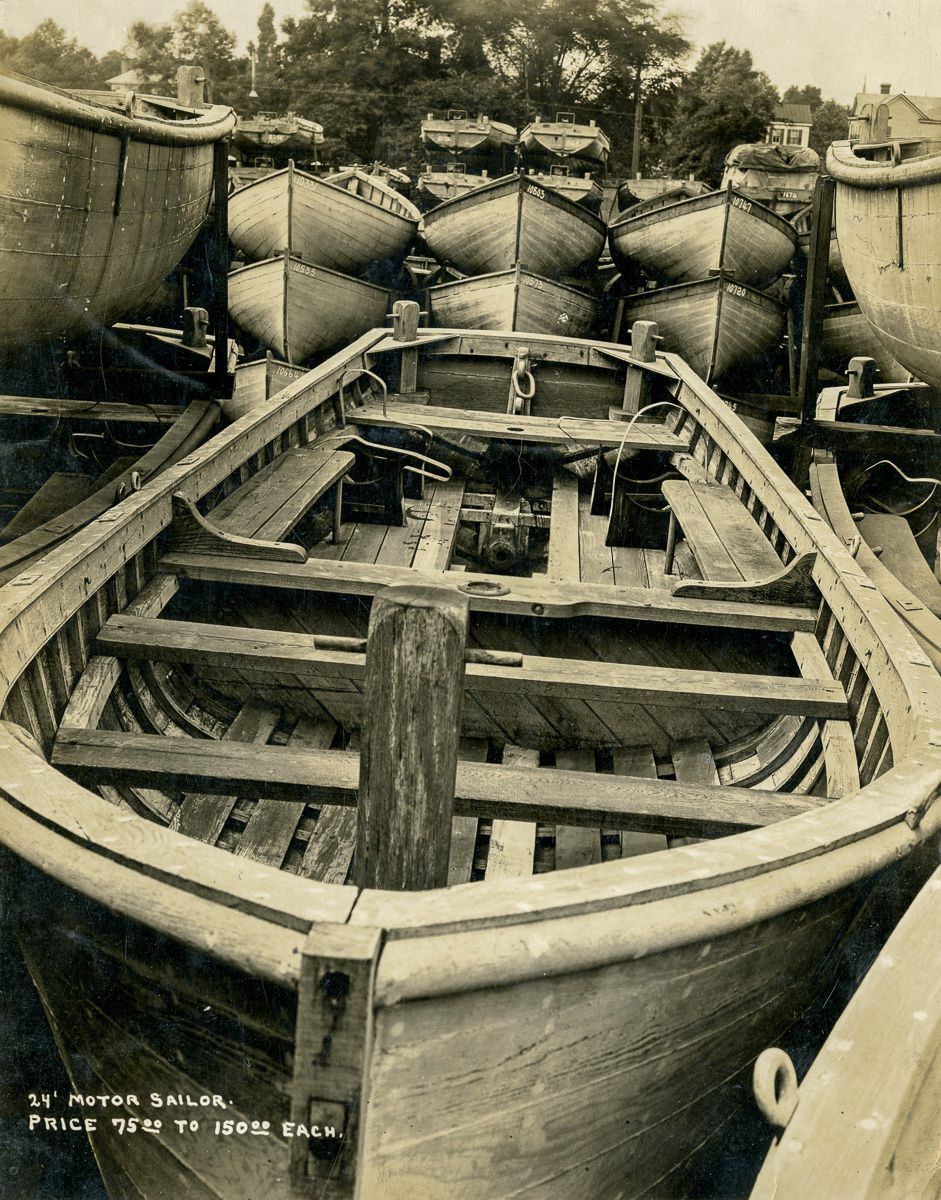 Stacked boats made by the New England Boat Works; the boat in the foreground is a 24-foot 'Motor Sailor,' listed at $75 to $150 each.Collection