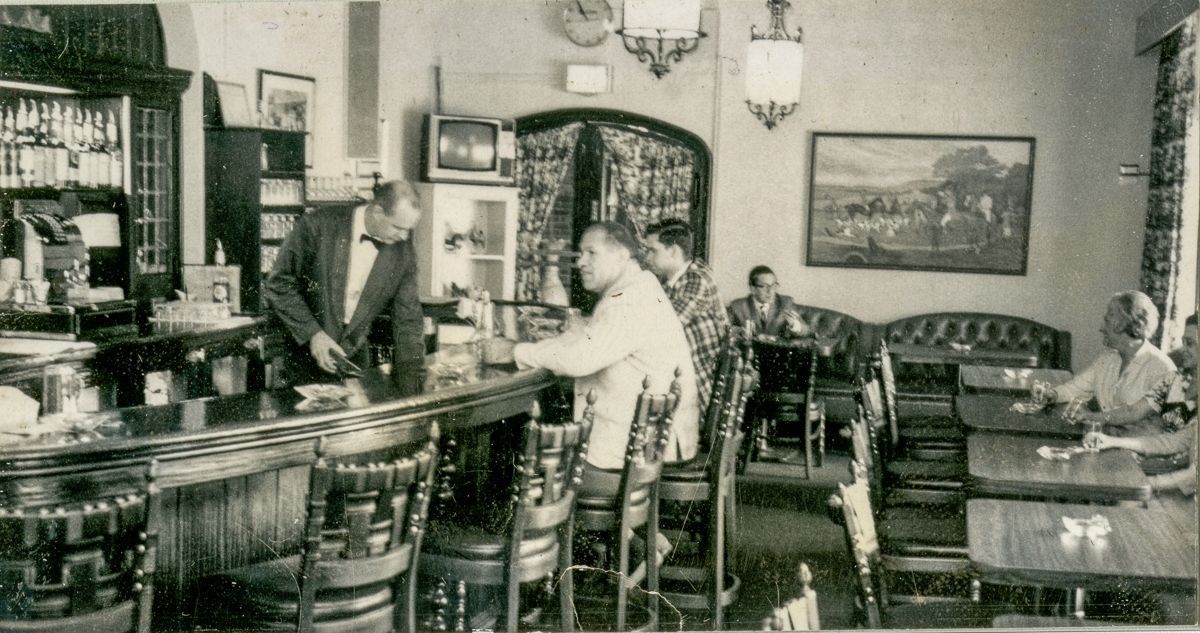 People sitting in the cocktail lounge of the Pickwick Arms hotel.