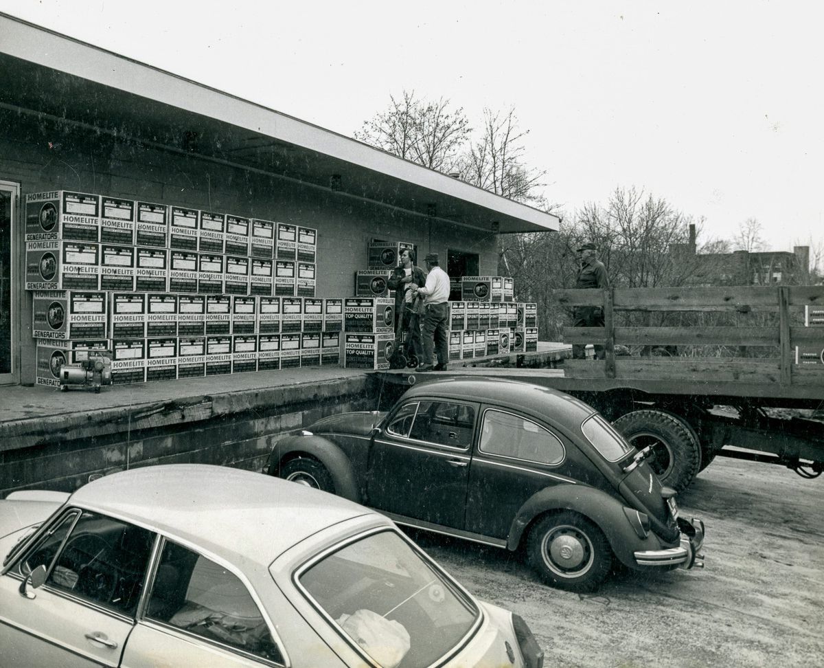 Two men standing on a loading dock filled with Homelite generators.