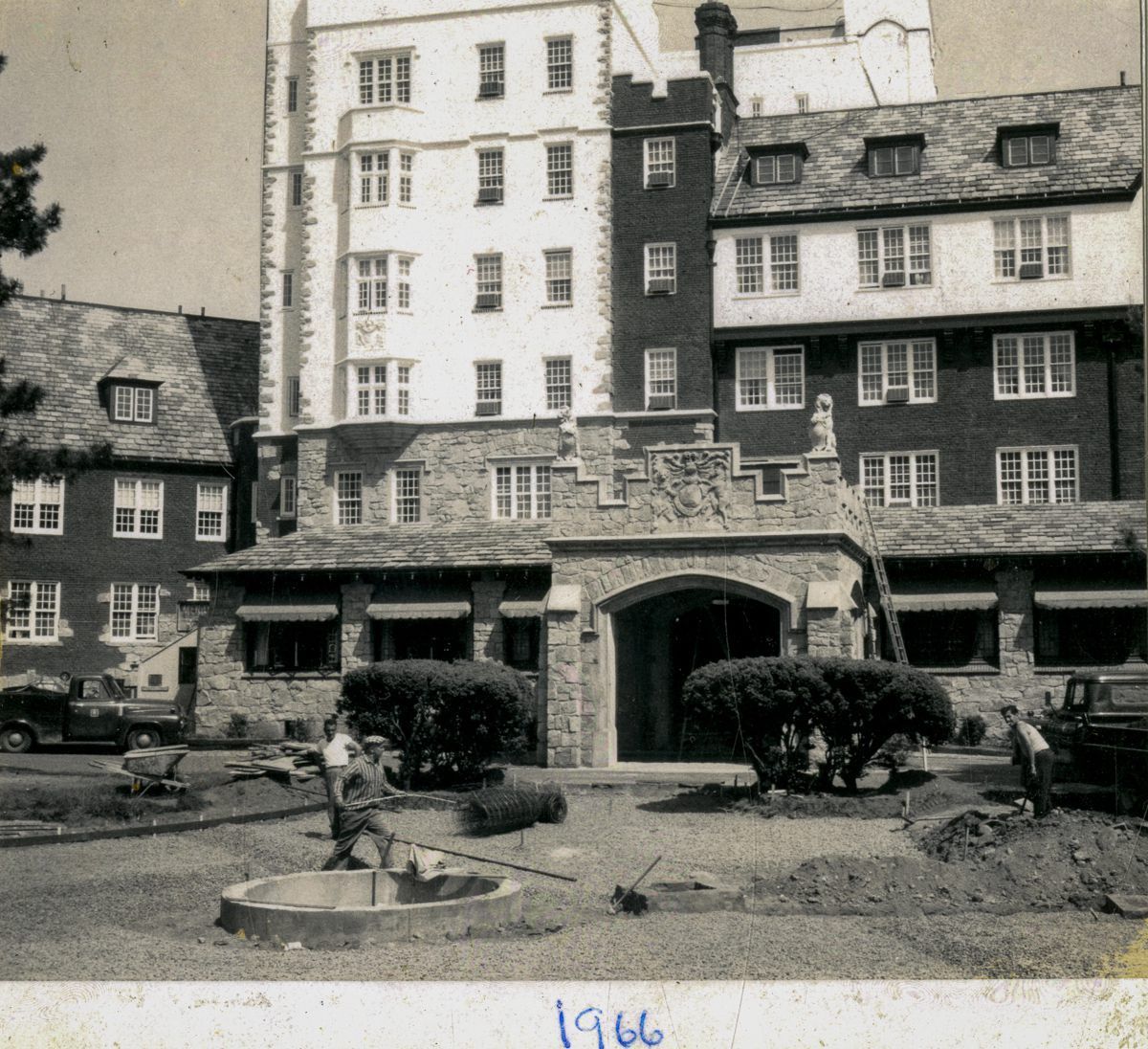 A view of the front of the Pickwick Arms hotel with men working on its front drive and garden. The Pickwick Arms opened in 1920 and was closed in 1972.Collection